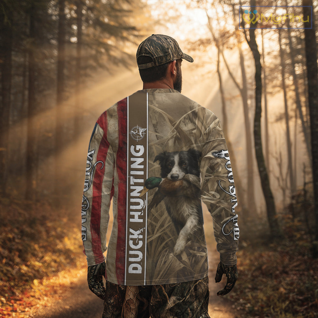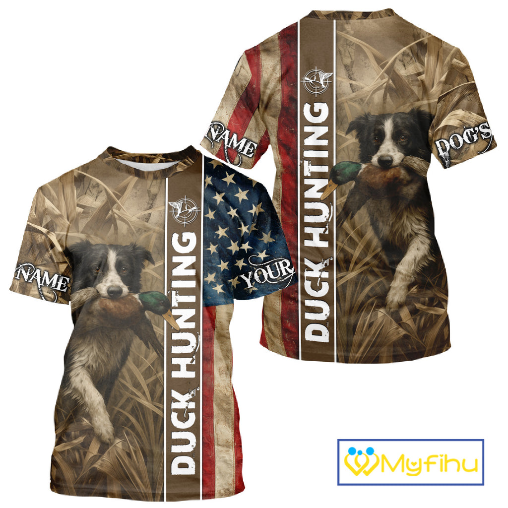 Border Collies Duck Hunting Waterfowl Camo US Flag Shirts, Custom Name Shirts, Hunting Gifts NBT96