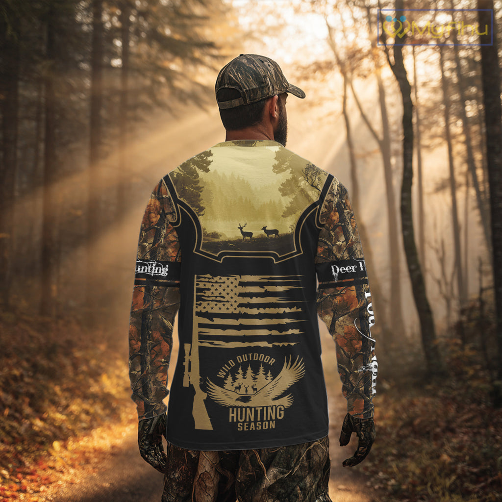 Designed for deer hunters and outdoor enthusiasts, this shirt blends style, comfort, breathable and funtionality in one. The unique hunting-inspired design can be personalized with your name, along with details like the American flag, camouflage patterns, and more - making it the perfect gift ideas for hunters during deer hunting season.