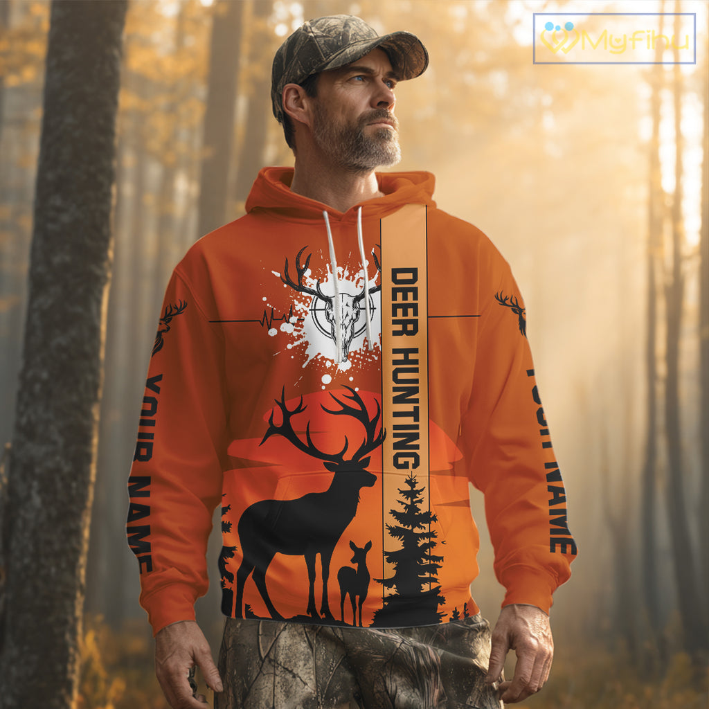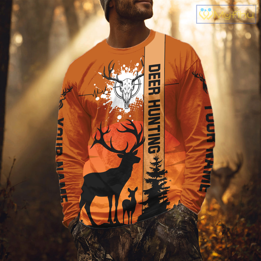 Custom Deer Hunting Shirt Orange 3D All Over Print with Deer Skull & Forest Silhouette NHT33