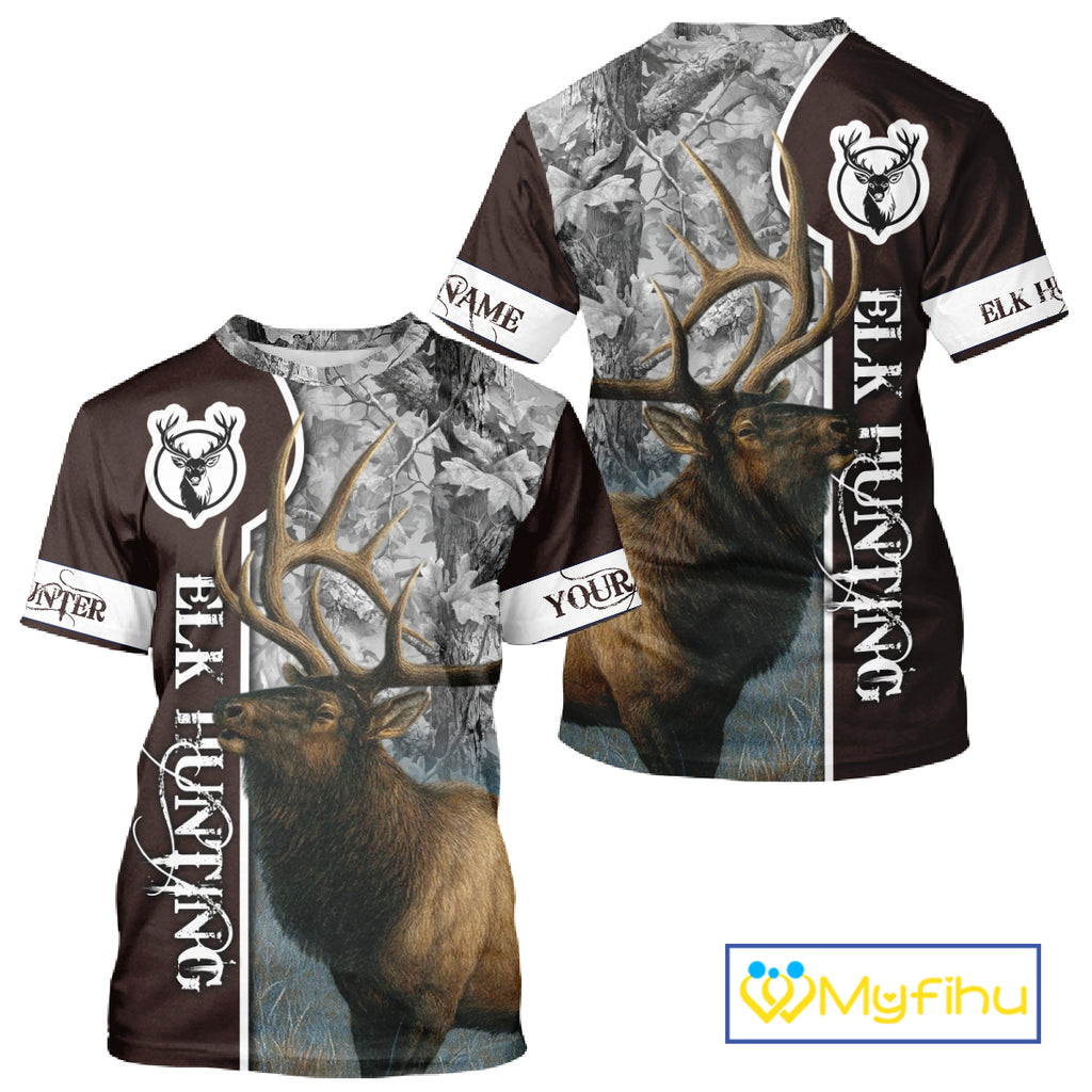 Elk Hunting Shirt Personalized 3D All Over Print Brown With Gray Camo Hunting Clothes NHT99