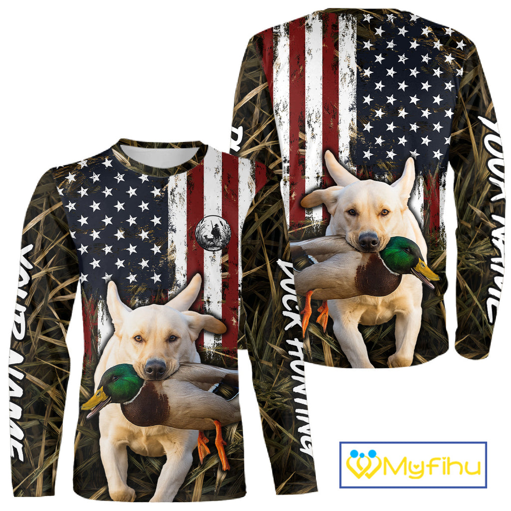Mallard Duck Hunting Shirt Personalized Camo With Dog Yellow Lab US Flag Hunting Clothes NHT166