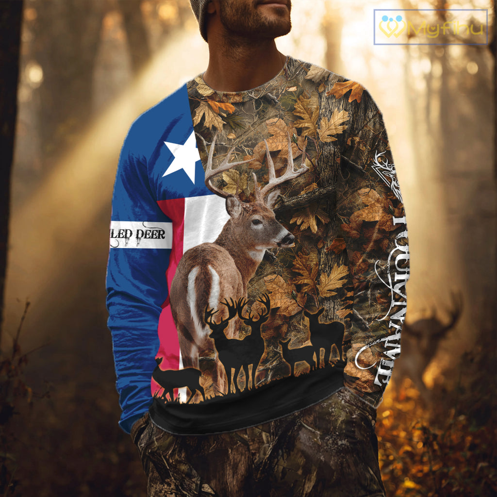 Texas Flag Fall Camo Deer Hunting Hoodie, Longsleeve Shirt - Personalized Name Option NBT12