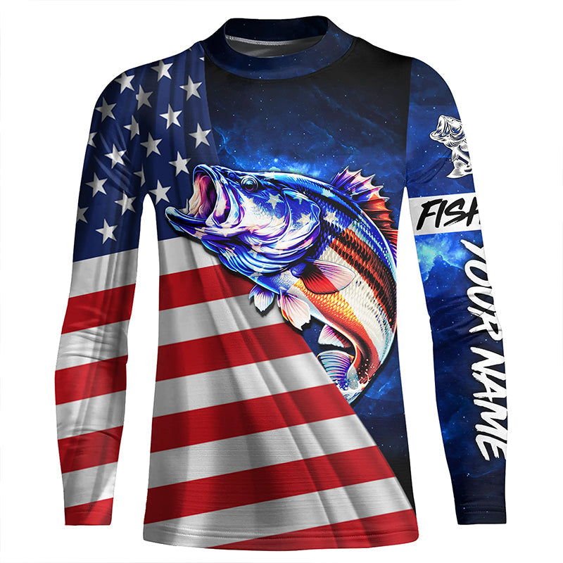 Bass Fishing 3D American Flag patriotic blue galaxy Custom UV protection long sleeve Fishing Shirts NQS5396