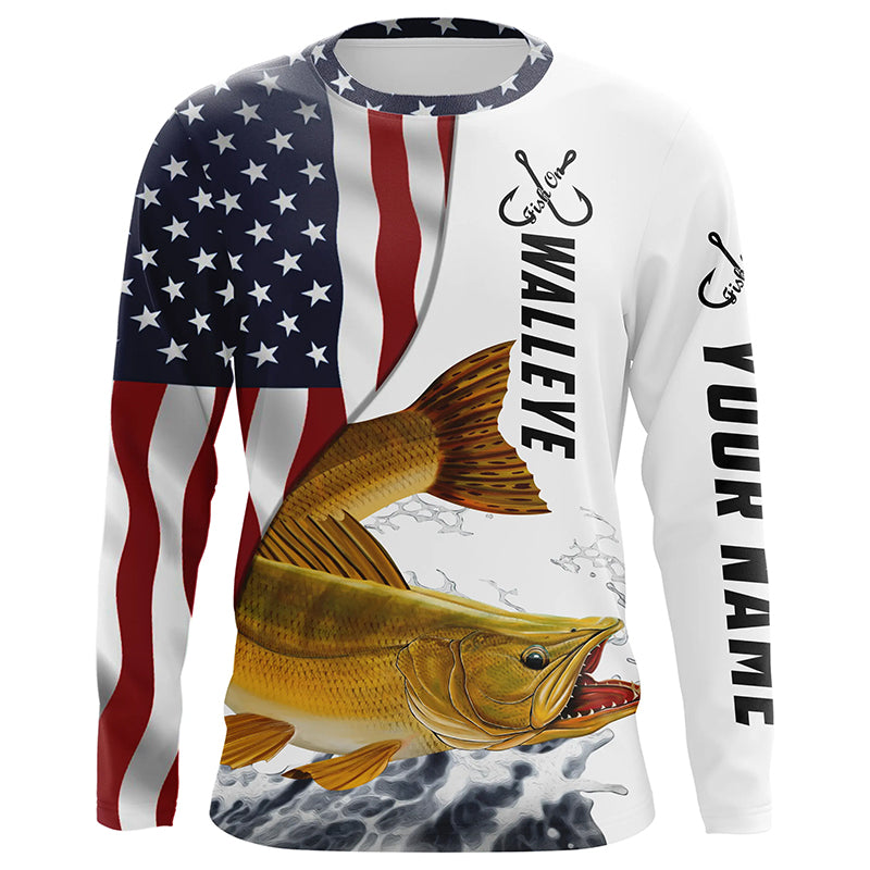 Walleye Fishing American Flag Custom Long Sleeve Fishing Shirts, Patriotic Fishing Jerseys IPHW4655
