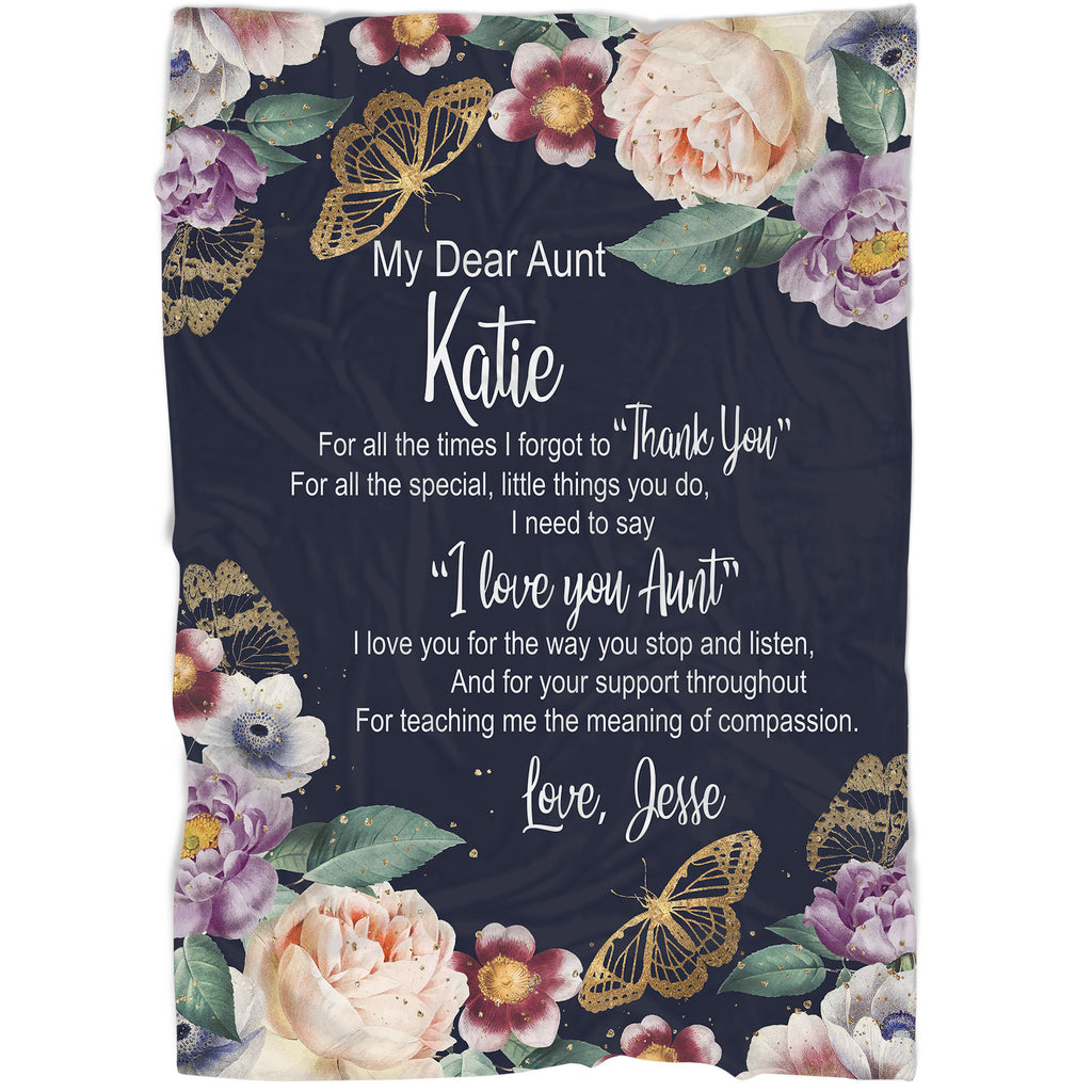 Personalized My Dear Aunt Blanket| Aunt Blue Blanket with Flower Butterfly| Custom Gift for Aunt from Nephew Niece| Sentimental Gift for Auntie on Christmas Birthday Mother's Day| JB213