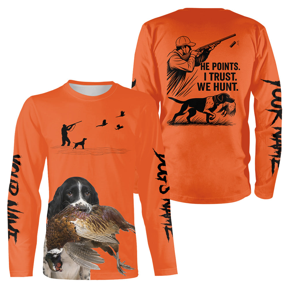 Designed for passionate hunters and dog lovers, this custom hunting hoodie combines rugged style with personal customization. Featuring a lifelike image of a hunting dog in action, pheasant hunting, and orange color scheme, this hoodie is a must-have for any hunting enthusiast.