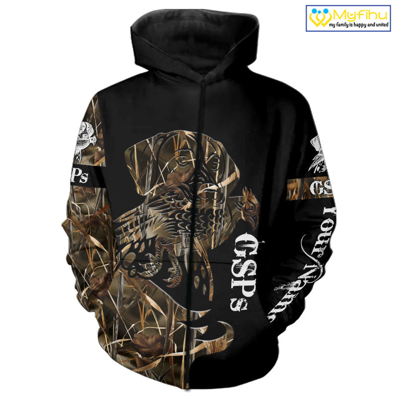 Designed for passionate hunters and dog lovers, this custom hunting hoodie combines rugged style with personal customization. Featuring a lifelike image of a hunting dog in action, retrieving a pheasant, duck, grouse, set against a camouflage and black color scheme, this hoodie is a must-have for any hunting enthusiast.