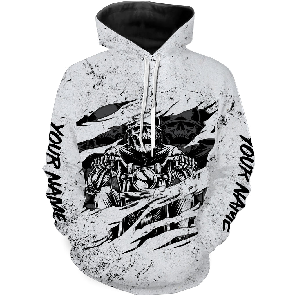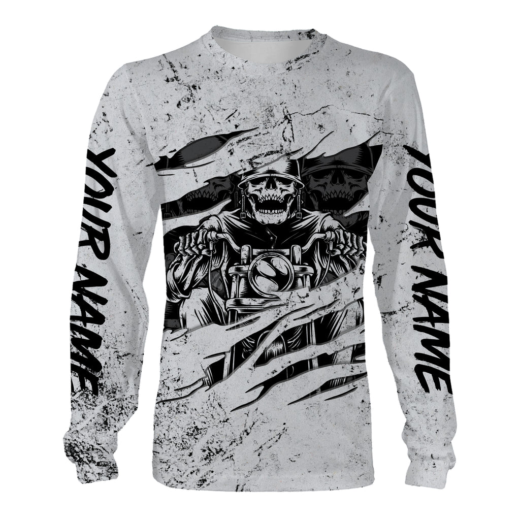 Gray Skull Biker Personalized Long Sleeves Hoodie T-shirt, Cool Off-road Racing Motorcycle Shirt| NMS310