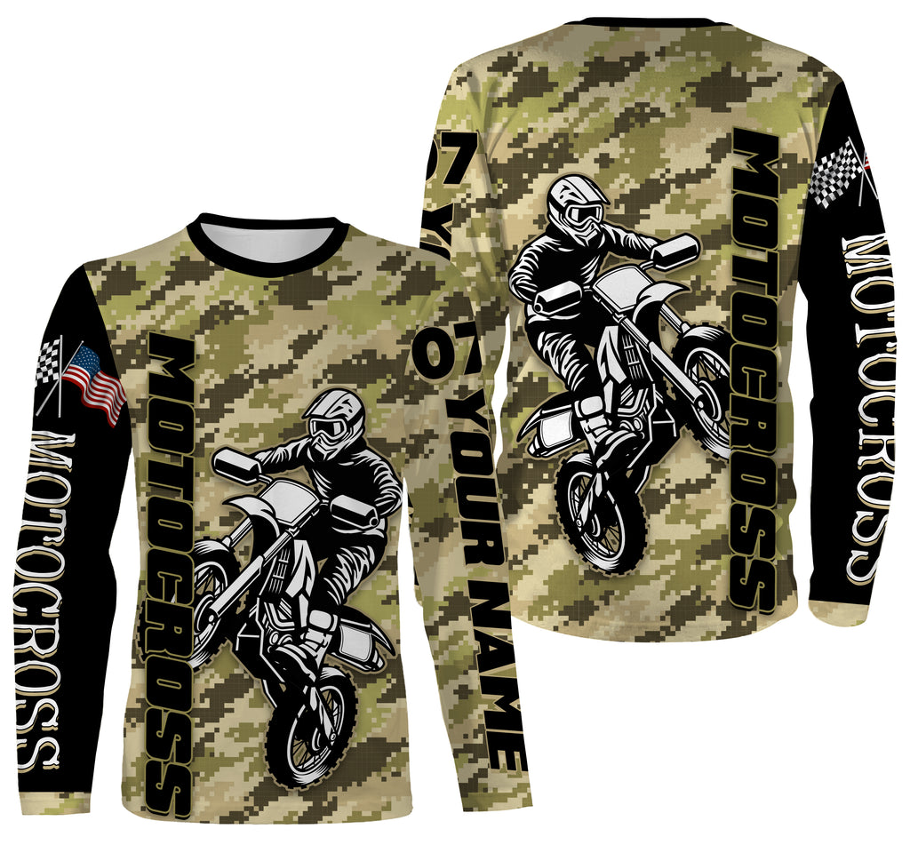 Motocross Rider Personalized Long Sleeves Hoodie T-shirt, Camo All Over Printed Motorcycle Off-road| NMS299