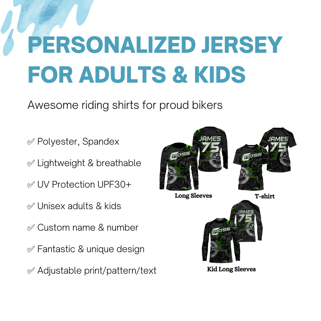 • PERSONALIZED MOTORCYCLE JERSEY: This super cool long-sleeved shirt is exactly what all bikers are looking for. Add your name/number to make it a unique one that bears your own imprints.