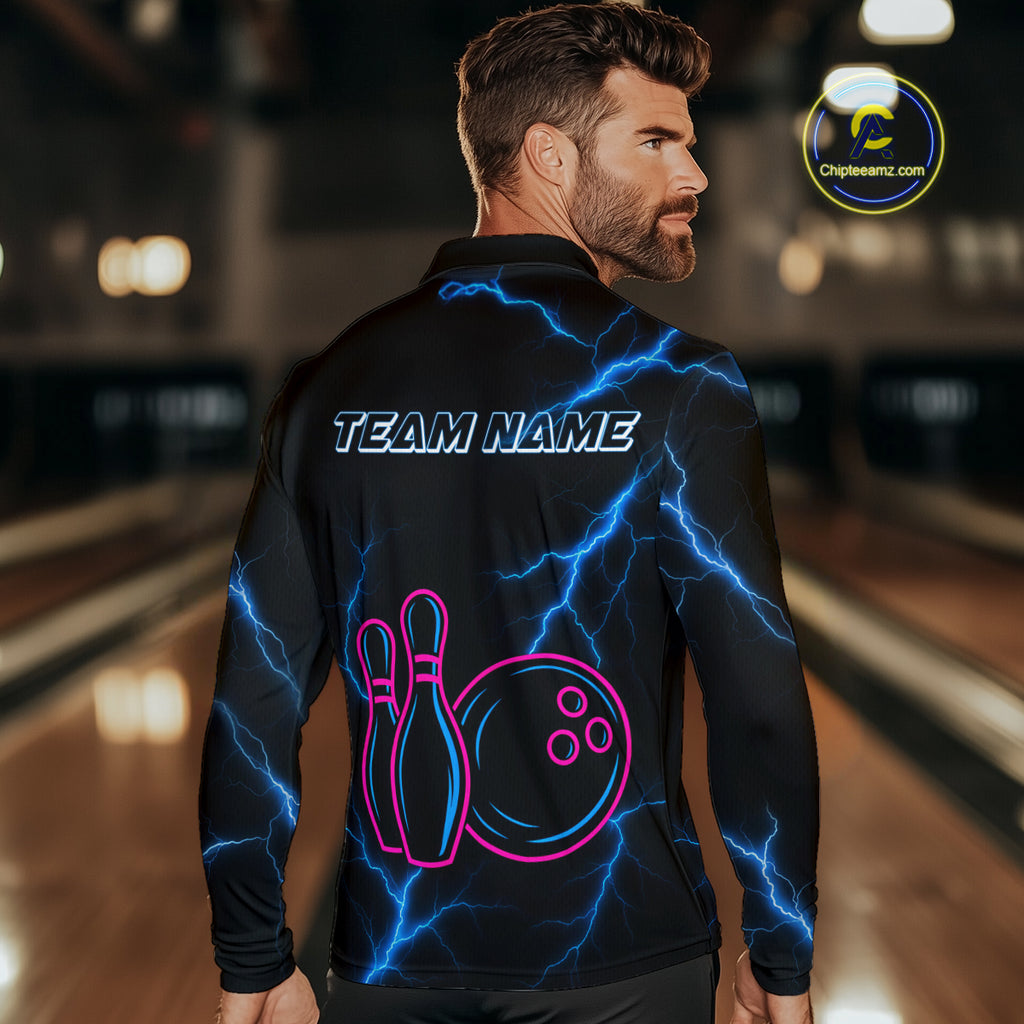 Blue lightning thunder pink neon Bowling Polo, Quarter Zip Shirts For Men Custom Bowling Team Jersey NQS10181