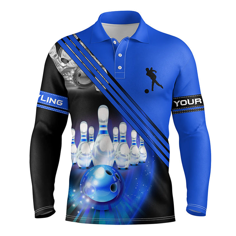 Custom bowling shirts for men bowling ball and pins team shirt, custom bowling jerseys | Blue NQS4452