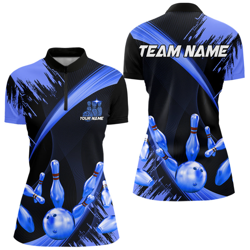 Personalized Black and Blue Bowling Polo, Quarter Zip Shirts For Women Custom Bowling Team Jersey NQS9723