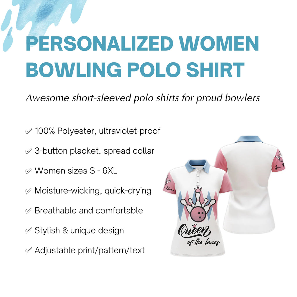 Personalized Women Bowling Polo Shirt, Queen of The Lanes, Short Sleeve Female Bowlers Jersey NBP30