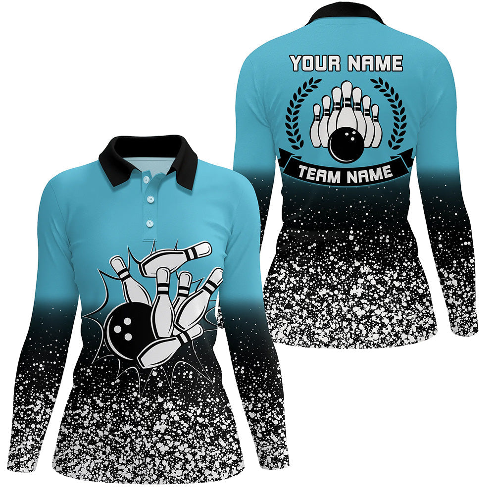 Women bowling polo shirts Custom retro bowling ball pins strike team league jerseys | Blue NQS6407