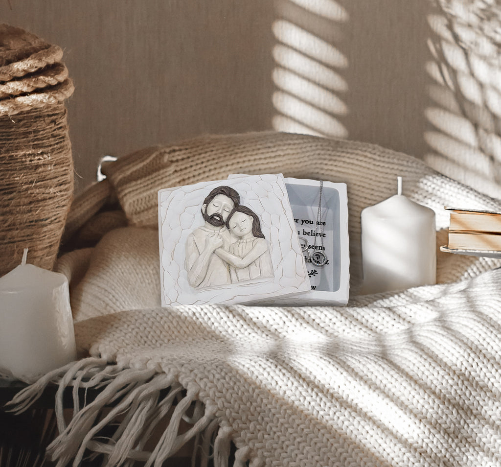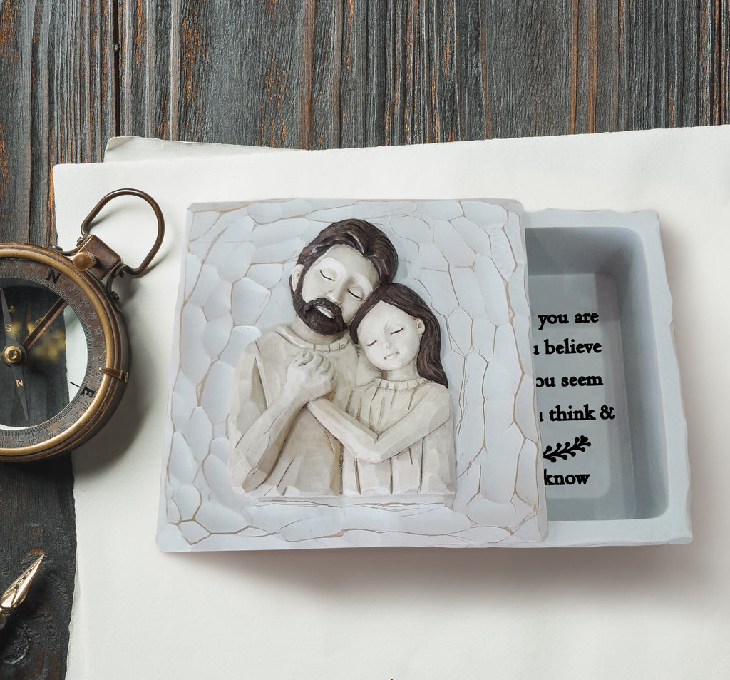 Celebrate the bond of father and daughter with this keepsake box. Crafted with care, this elegant 4.5x4.5x2.5 inch box is made from durable polyresin and adorned with intricate hand-painted details. It's more than just a box; it's a symbol of cherished memories, love, and the unbreakable connection between a father and his daughter.