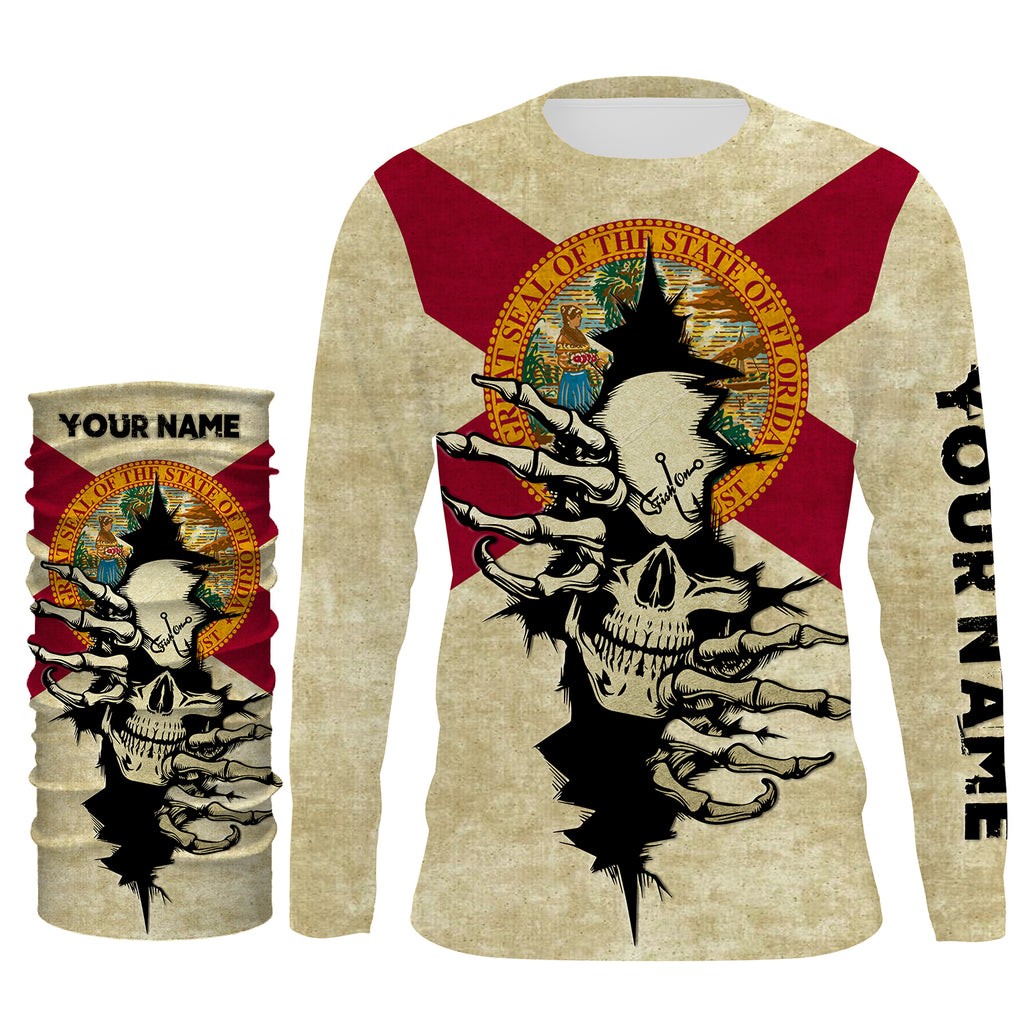 Florida Flag Skull Fish On Custom Long Sleeve Performance Shirts, Personalized Patriotic Fishing Gifts TTN74