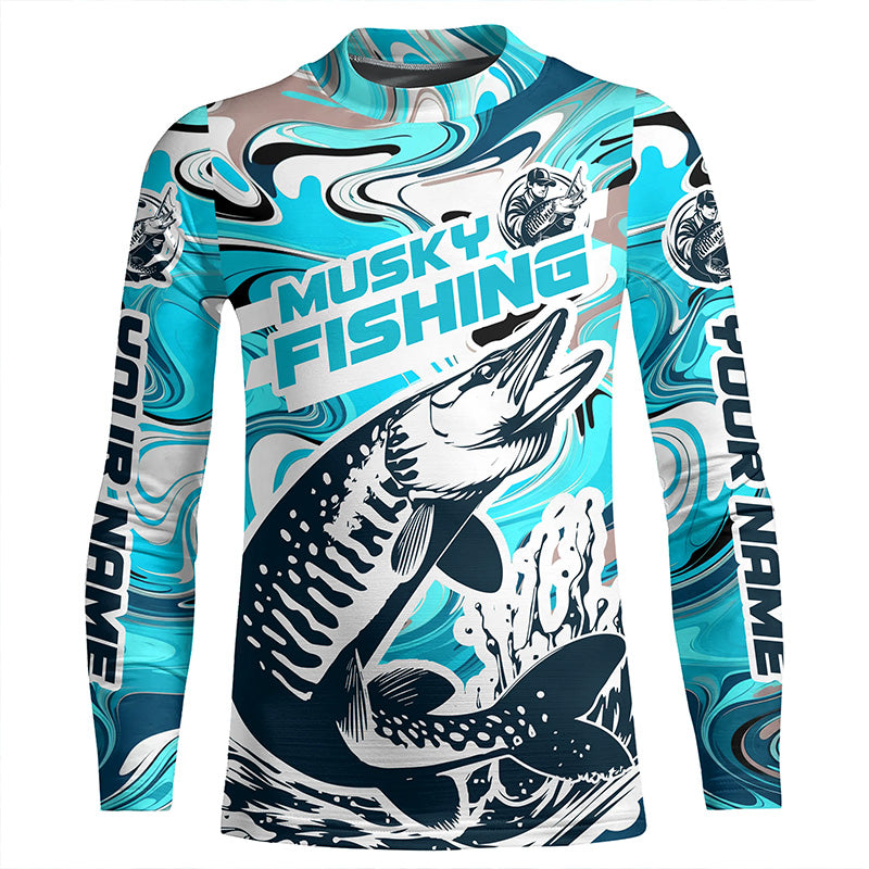Custom Musky Long Sleeve Tournament Fishing Shirts, Water Camo Muskie Fishing Jerseys | Teal Blue IPHW6166