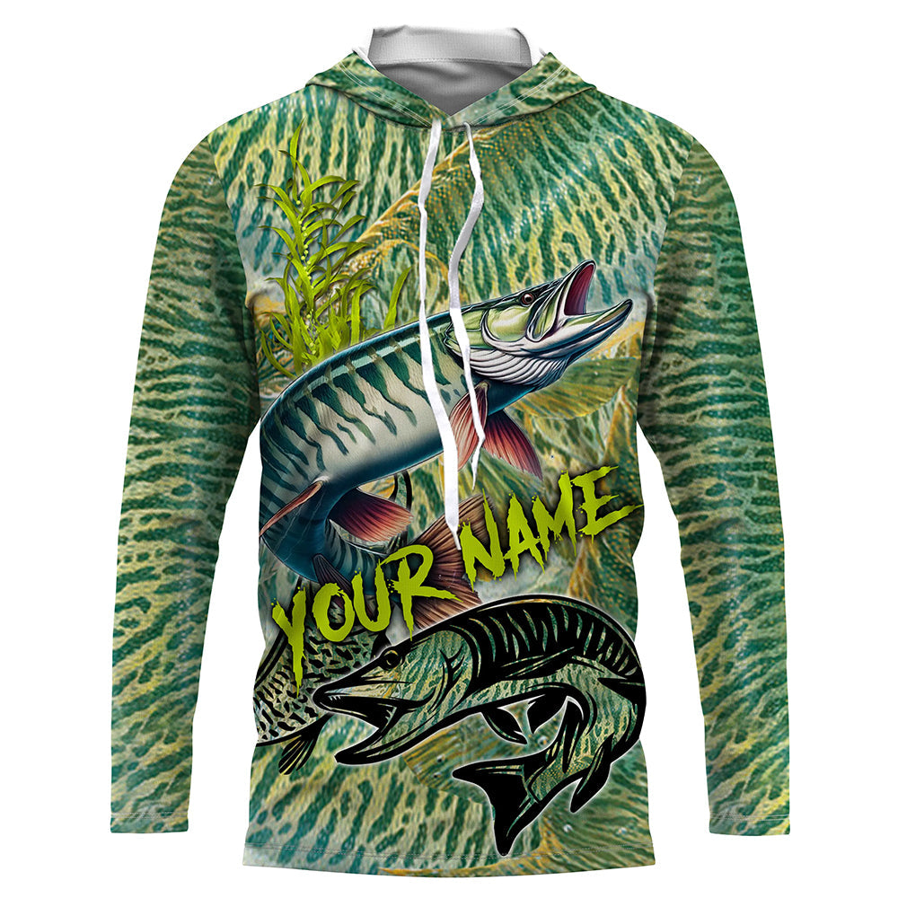 Personalized Muskellunge Fishing jerseys, Musky green scales long sleeve fishing shirts NQS3684