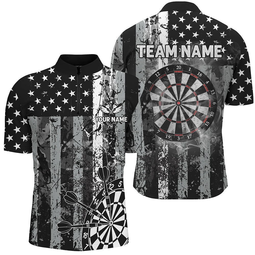 Custom Black Grunge US Flag Patriotic Dart Shirts For Men, Retro Darts Board Smoke Dart Team Jersey TDM2852