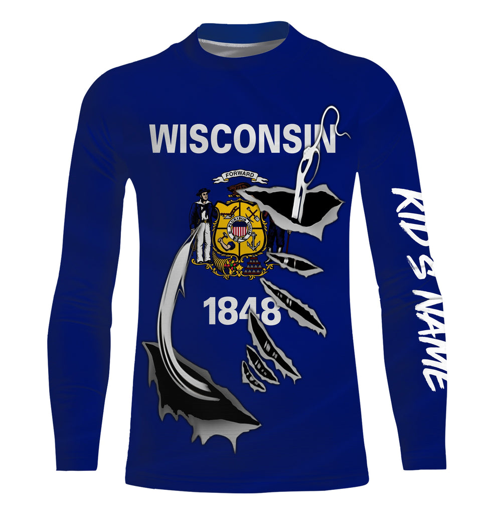 WI Wisconsin Flag Fishing 3D Fish Hook UV protection Custom Long sleeves Fishing Shirts, Patriotic fishing gifts - IPH1912