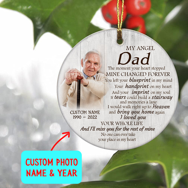 The memory Christmas ornament with meaningful words, personalized picture, name and dates is a heartfelt remembrance keepsake for the loved ones in heaven in holiday season.